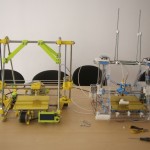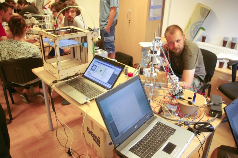 Na warsztatach poza dwoma zbudowanymi maszynamy były też gościnnie 4 inne drukarki (Prusa Mendel/BiBONE/ZMorph oraz Ultimaker). W sumie dało to 6 drukarek w jednym pomieszczeniu, co było chyba rekordem jeśli chodzi o ilość drukarek na metr kwadratowy tego lata 🙂