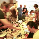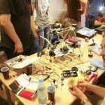 Warsztaty poprowadził Przemek Jaworski (piszący ten artykuł) we współpracy z Konradem Klepackim oraz Krzysztofem Dymianiukiem (mojreprap.pl). Pierwszy dzień (piątek) rozpoczął się dłuższą prezentacją wprowadzającą w temat, a potem pierwszym pokazowym wydrukiem. Po krótkiej przerwie uczestnicy podzielili się na dwie grupy i z dostępnych elementów zaczęli składać dwie kompletne drukarki Prusa Mendel.