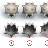 Wszystkie trzy modele z zewnątrz wygladają tak samo. Natomiast pierwszy się kompletnie nie nadaje do druku, ponieważ zrówno kula, jak i stożki są osobnymi obiektami, i wszystkie są otwarte (nie są „watertight”). Drugi pokazuje kulę i stożki jako osobne zamknięte „watertight” obiekty nakładające się na siebie. Taki zbiór obiektów być może się wydrukuje, ale software może potraktować cześć wspólną kuli i stożków np. jako zewnętrze i niczym go nie wypełnić, albo zrobić coś równie dziwnego. Zdecydowanie lepiej unikać takich sytuacji. Trzeci przykład pokazuje model, który dobrze spełnia warunki #1 i #2.
